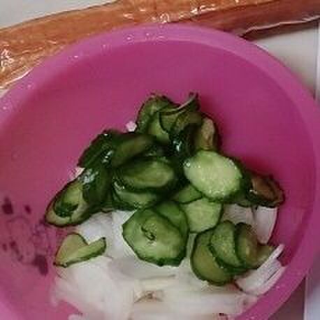 キュウリは薄くスライスしたら塩でもみます。