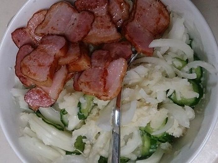 ベーコンは、少し厚めに切りカリカリに焼きます。