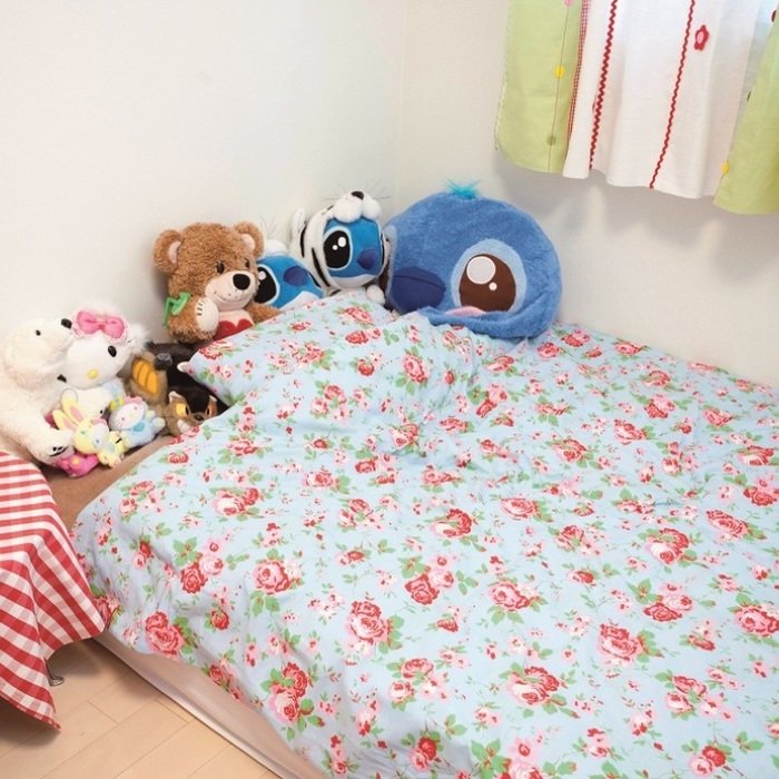 ブルーのベッドカバーはROSALI。花柄でフェミニンに!