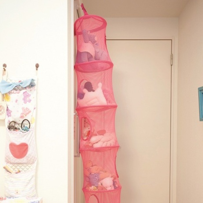 かさばるぬいぐるみ類はドア付近にかけたハンギングIKEA PS FANGSTに収納。縦にコンパクトに収納できるスグレもの。