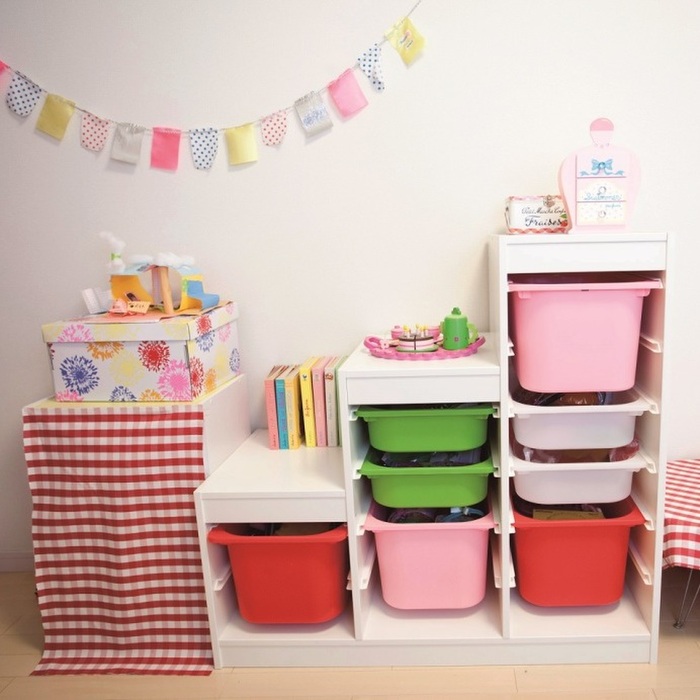 部屋の雰囲気に合わせて、中のボックスのカラーを選べる、大人気の収納コンビネーションTROFASTには、おもちゃなどを収納。引き出しごとに何を入れるか自分で考え、お片付けの練習も。サイドの小さな本棚はチェックの布地(BERTA RUTA)で目隠しをしてすっきり。