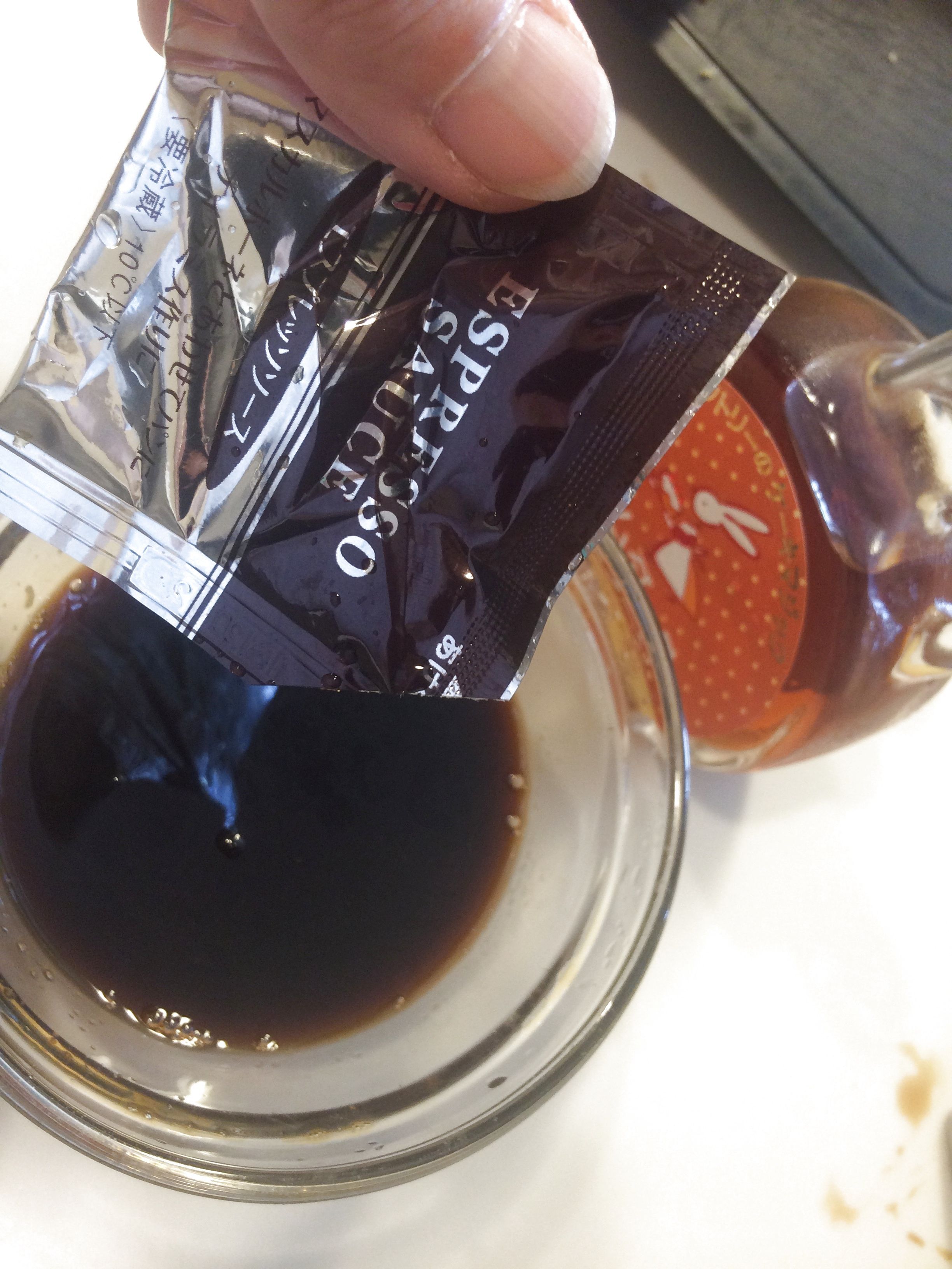 ②耐熱器に水を入れレンジで加熱。インスタントコーヒーを溶かし、マスカルポーネチーズの付属エスプレッソソースを入れて混ぜ合わせる。