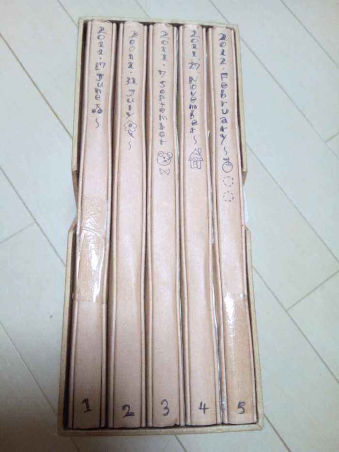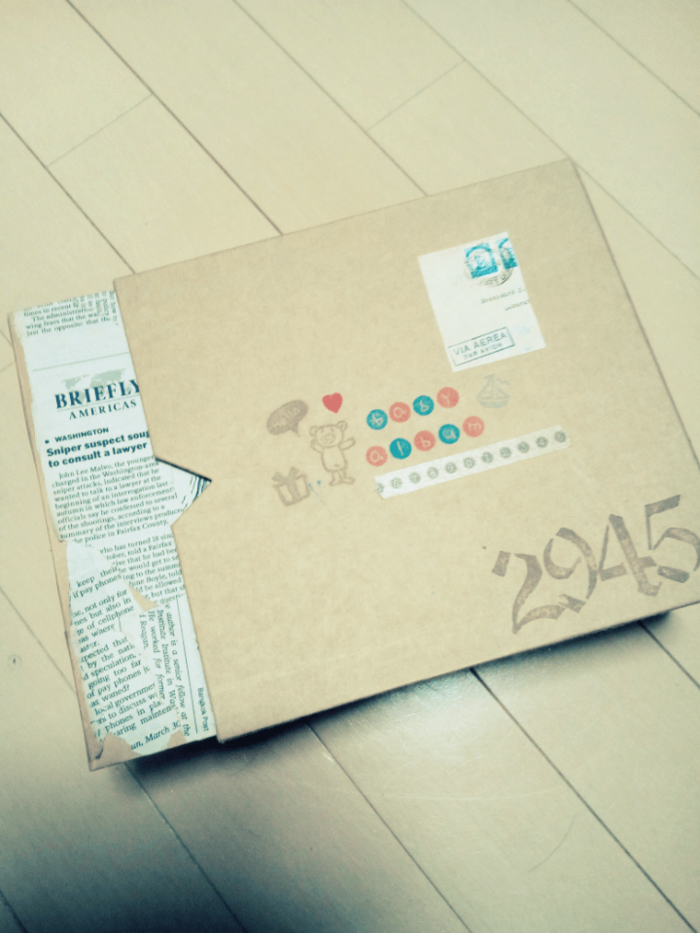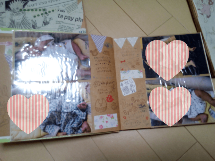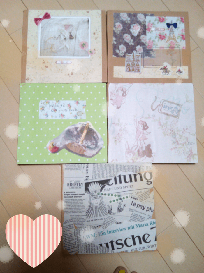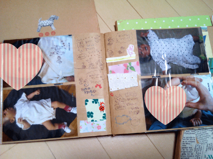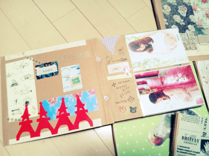 アルバムの表紙は英字新聞やかわいい布をカラーコピーして一面に貼ったもの。キャスキッドソンの布がかわいいです!