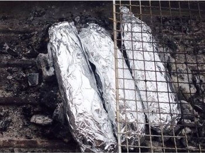 残り2本も同じよいに包み、炭の上に直接置いて10分くらい蒸し焼きにします。