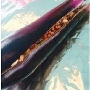 ナスのヘタの部分を剥がし縦半分に切る。中身をくりぬいてく、くりぬいた中身を刻む。