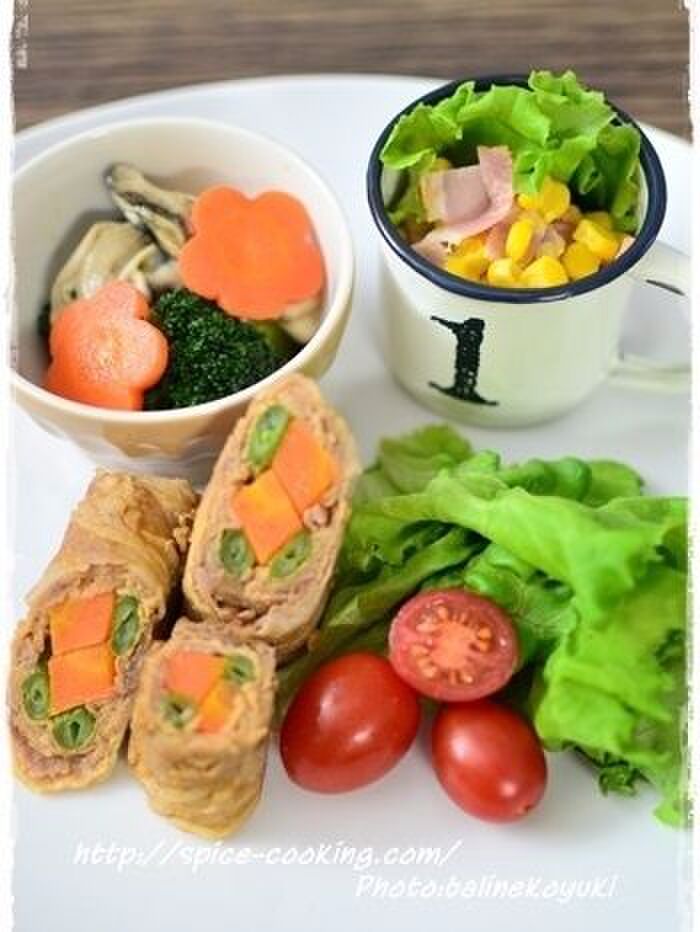 耐熱皿に人参を入れ、ラップをしてレンジ600wで1分加熱する。いんげんを加え再び600wで1分加熱する。