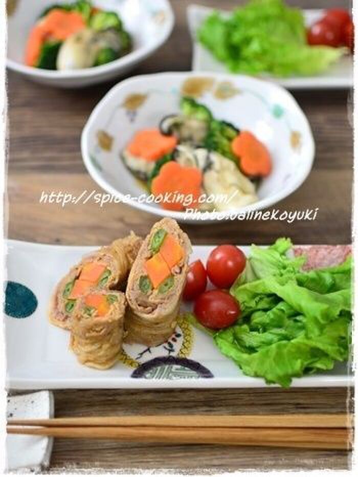 1の豚肉を広げ3枚ずつ並べ(1/3くらい重ねる)2の人参といんげんを乗せて巻く。巻き終わりを下にして耐熱皿に並べ、ラップをしてレンジ600wで2分加熱する。