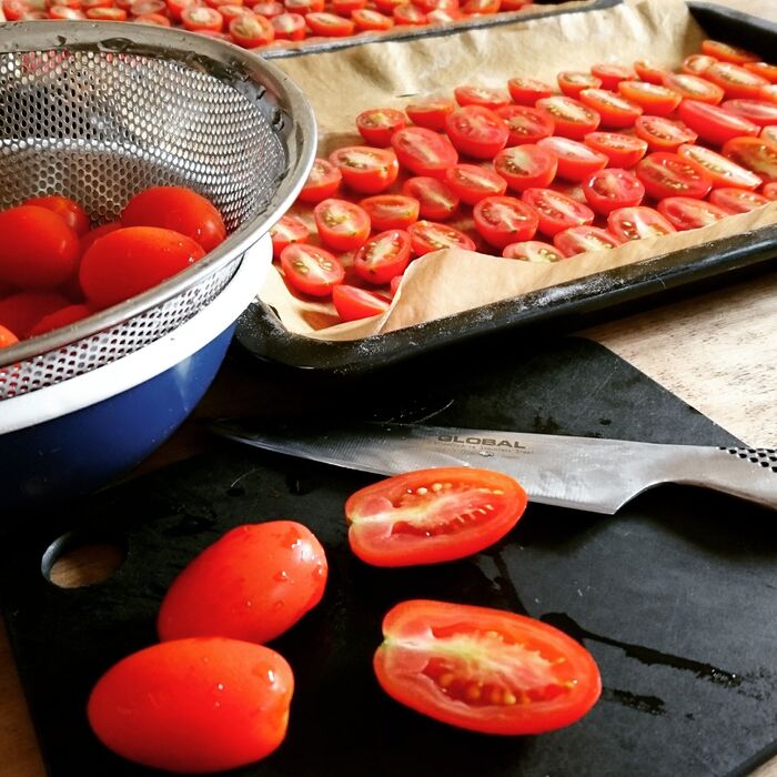 イタリアン食材の棚にビン詰めのドライトマトのオイル漬けも並んでいますが、我が家はプチトマトが安い時にまとめてドライトマトをおうちで作ります。