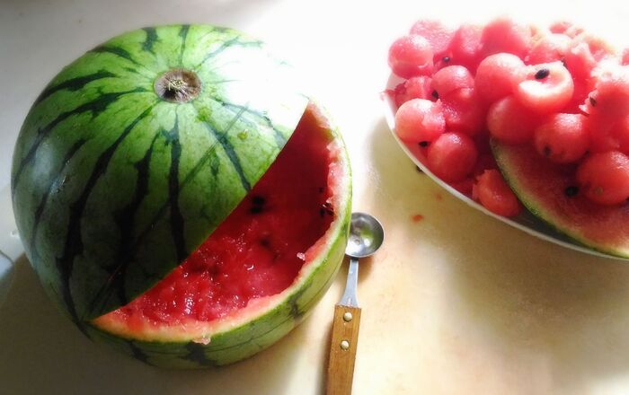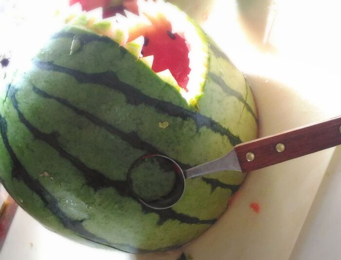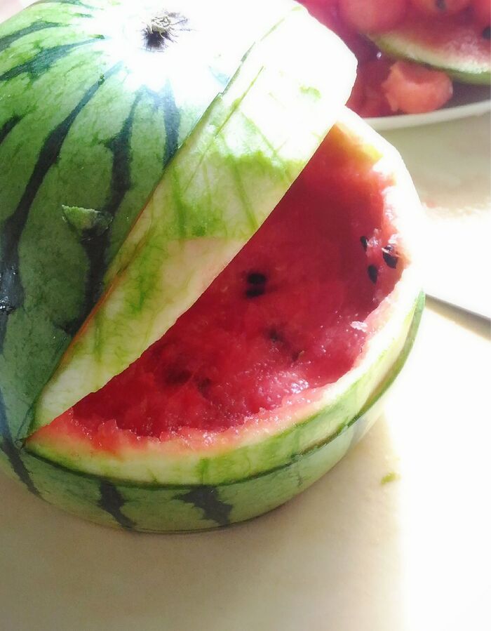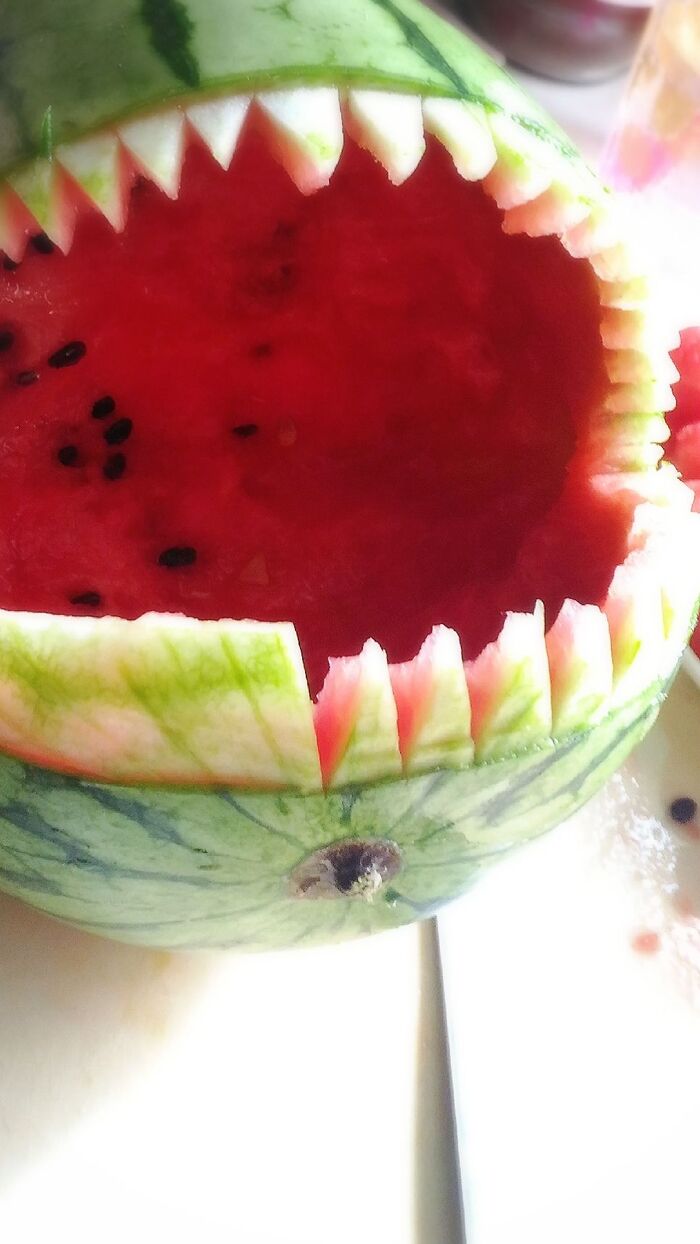 後は、口の中にくり抜いたスイカや、ぶどうを入れて完成~