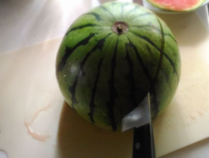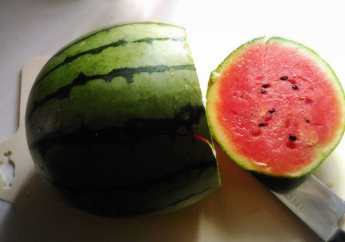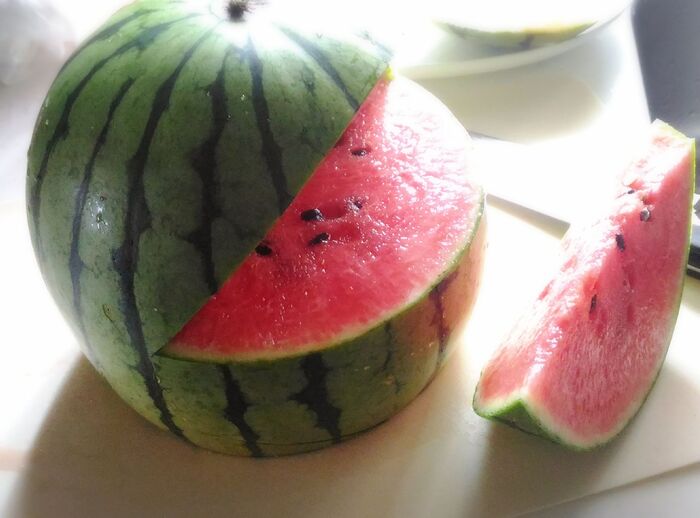 スイカ本体の真ん中に挟み込む幅をカットして、挟み込みます