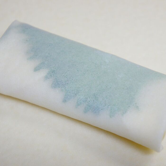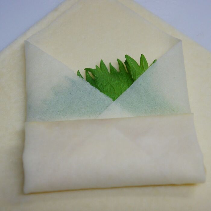 ⑤この状態まで巻いたら、6の写真のように大葉が半分透ける位置に大葉をずらして調節する。