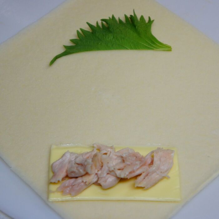 ④春巻きの皮のギリギリ下あたりにチーズとほぐしたささみ(とお好みで練り梅)、上に大葉を置き、下から巻いていく。