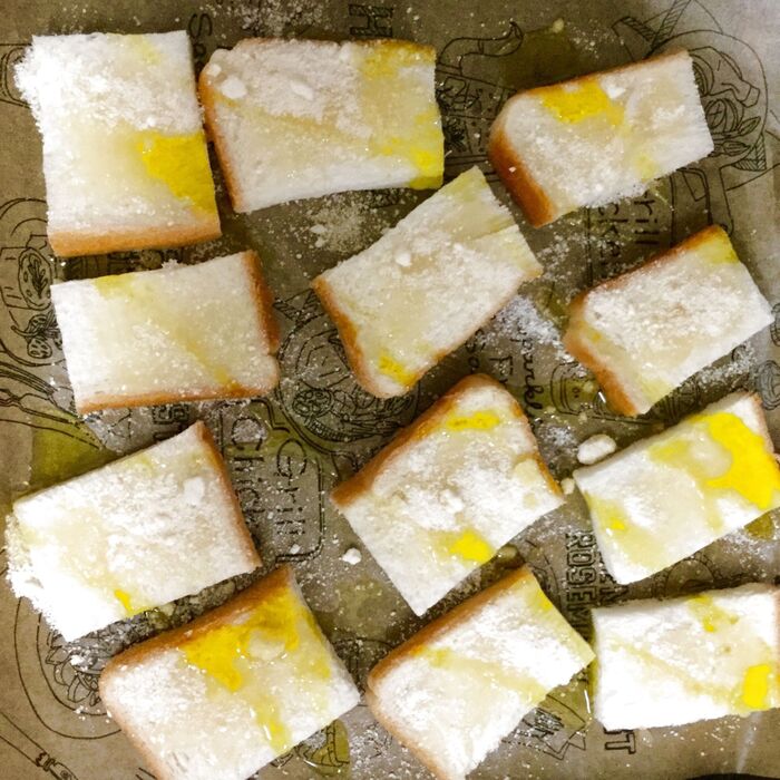食パンに、クリーミーはちみつ、ビート糖をまぶして、オリーブ油をかけて、