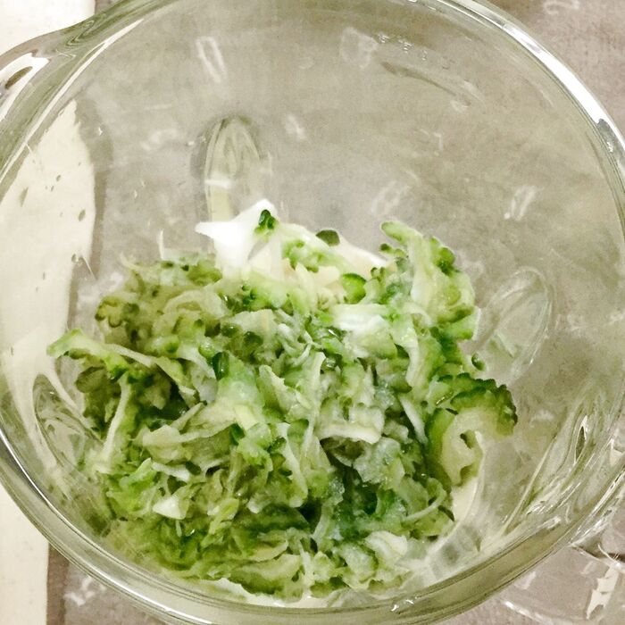 ゴーヤをスライスして、はちみつ、砂糖で揉んで漬けておきます。
