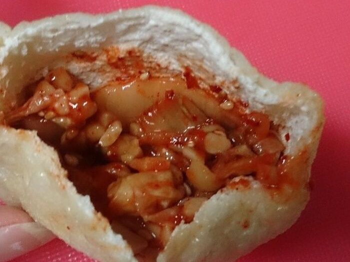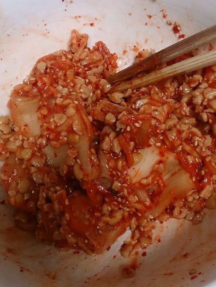 いつもは普通の納豆ですが今回はキムチを入れました。
