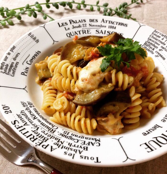 ⑤茄子とトマトがしんなりして水分が出てきたら、茹で上げたショートパスタを加えて水分を吸わせて、ツナを加えて塩胡椒で調味し、更にモッツァレラチーズを加え、サッと合わせて出来上がり。