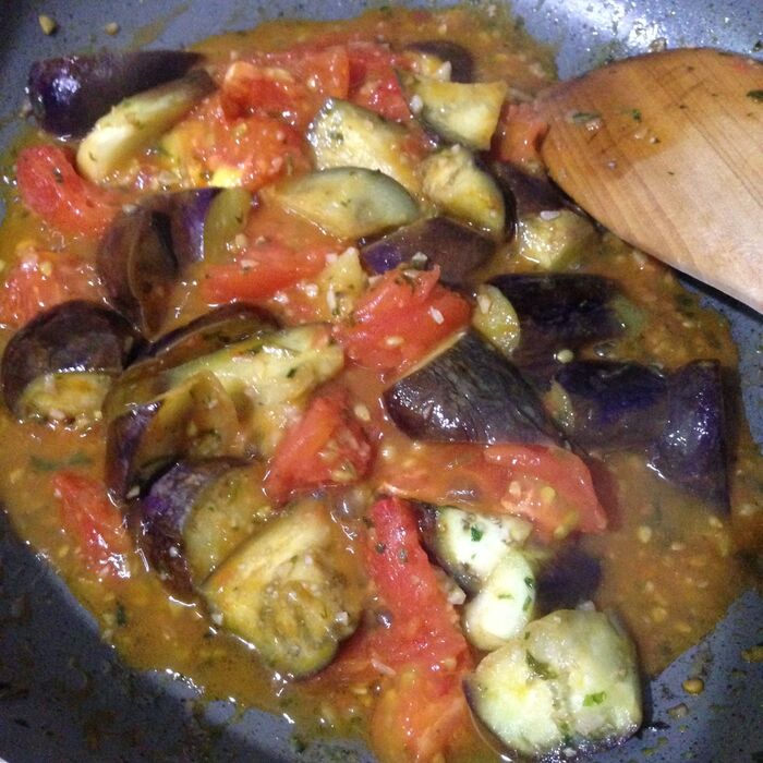 ④フライパンに少し多めにオリーブオイルをしいて、にんにくとイタリアンパセリを炒めて香りが立ってきたら、茄子を入れ、トマトも加えて炒め合わせます。