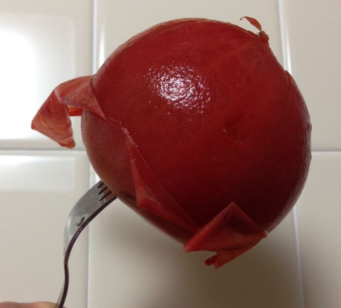 ②鍋にお湯を沸かします。トマトの下に十字に浅く切り込みをいれ、ヘタの方をフォークでさして皮を剥き、ざく切りにします。