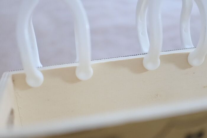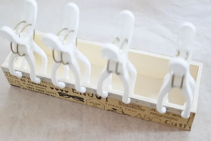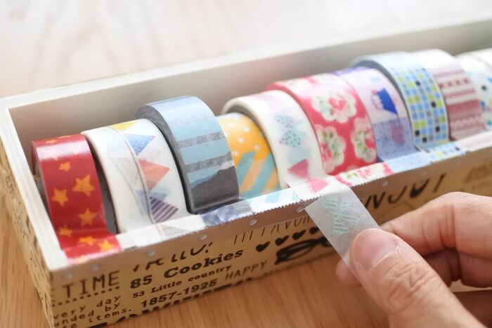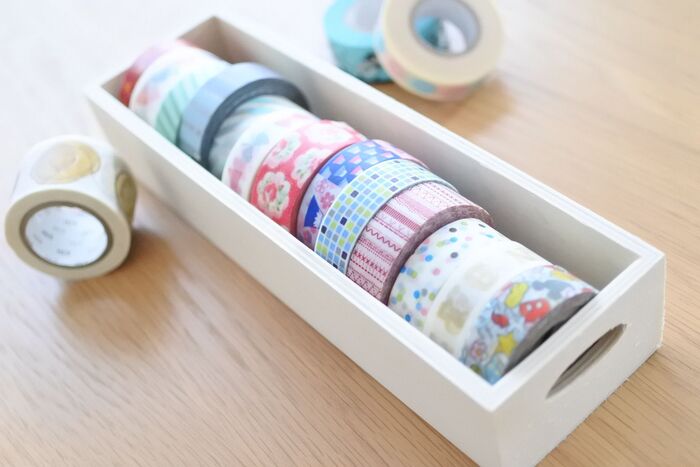 箱のサイドの穴からマステを全て紐を通して、箱の外で結べばマステがずれにくくなります