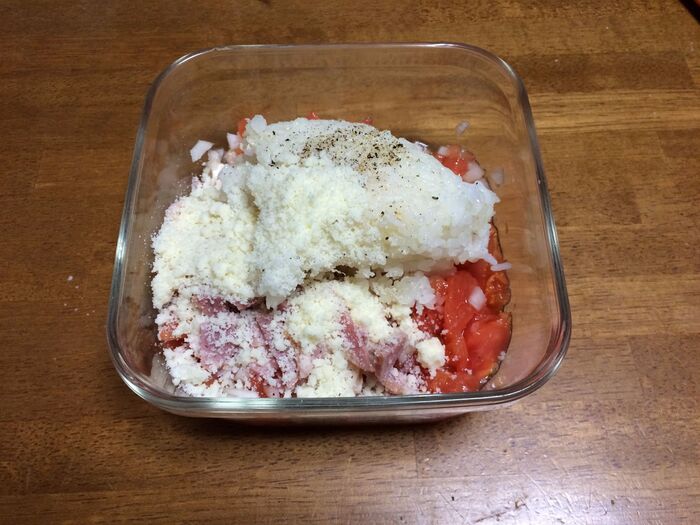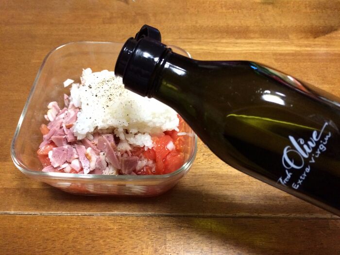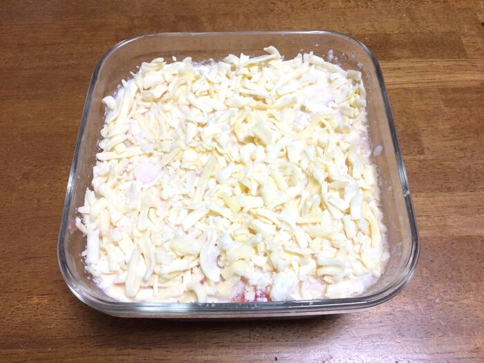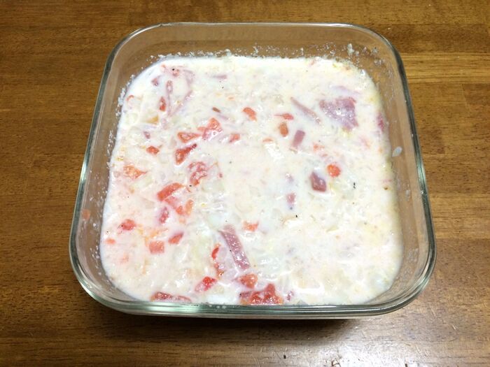 耐熱食器に、1~3の材料と、ごはんを入れ