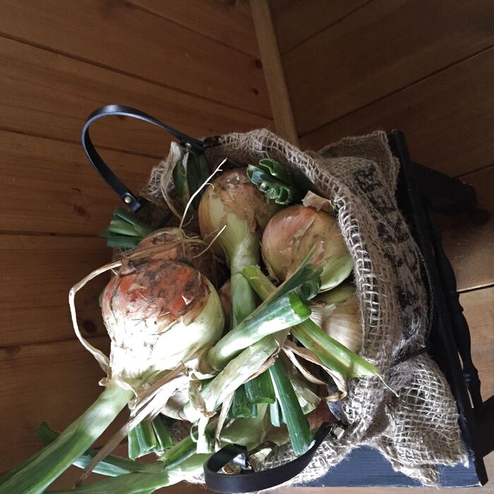 麻袋はぶら下げることはできても、麻袋だけだと自立しません。鉢スタンドをひっくり返して、その枠を利用することで、とっても丈夫な土台ができて、たくさんのお野菜をいれることができます♪