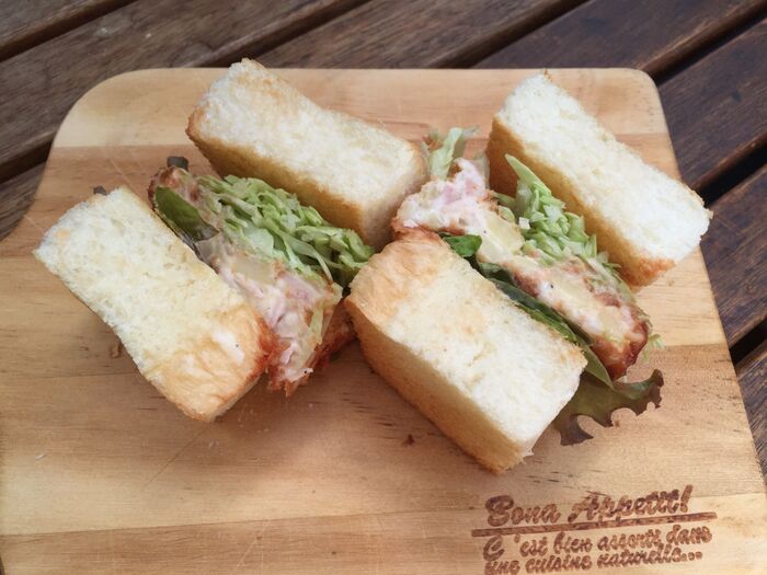 サニーレタスをコロッケの上にのせて食パンをのせたら出来上がり♪