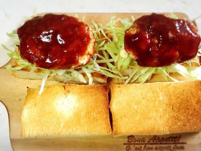 食パンを半分に切ってトースターでこんがりと焼きます。