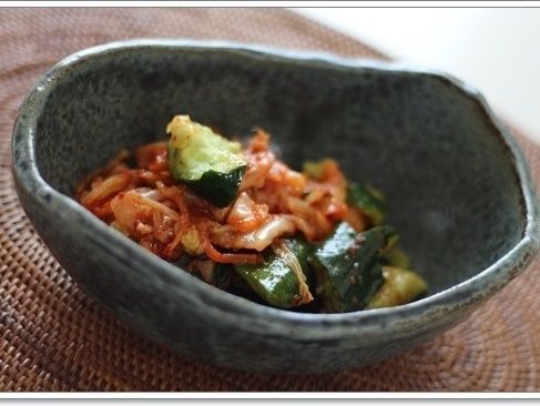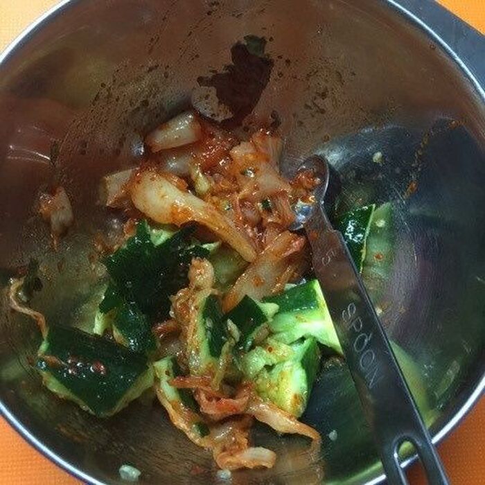②適当な大きさになったら、①をボウルに入れ、ごま油を全体に絡めます。キムチを加え、塩を少々~ひとつまみ入れます。全体に混ぜて味を見て器に盛ります。