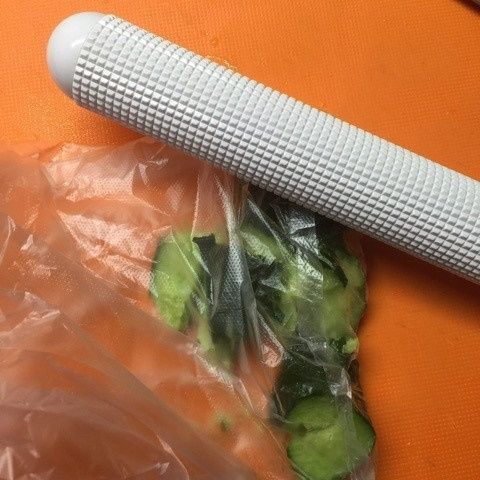 ①きゅうりはへたを取り、ビニール袋に入れて、めん棒でたたきます。
