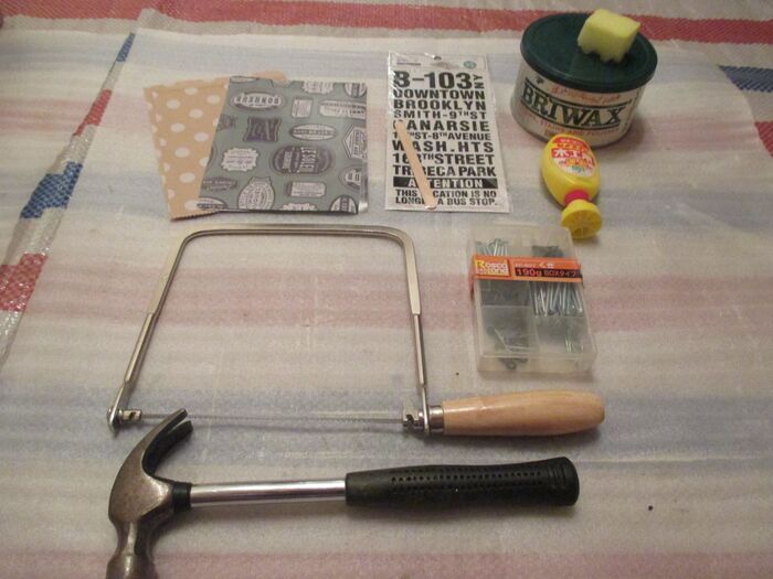 このぎり、かなづち、くぎ、やすり、台所用スポンジ
