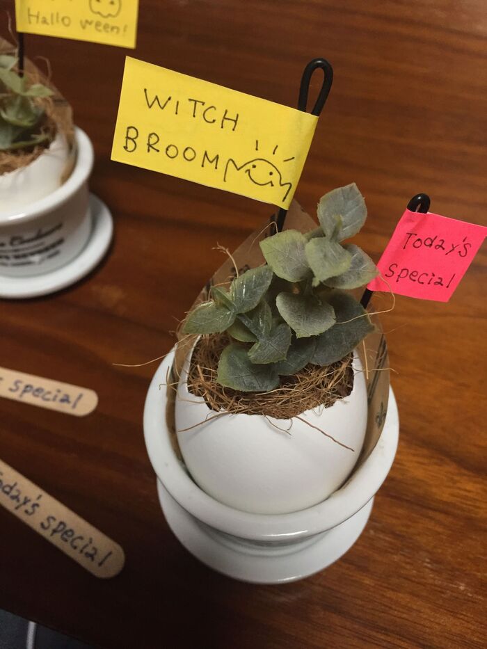 卵の殻の中に、椰子の木の繊維とフエィクグリーンを入れてピックをさしたら完成です