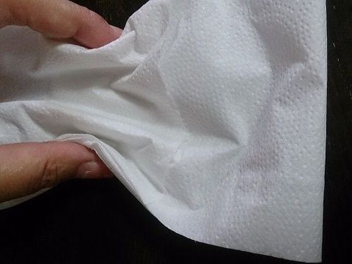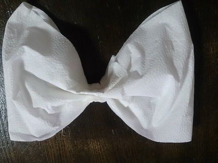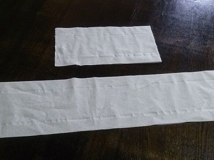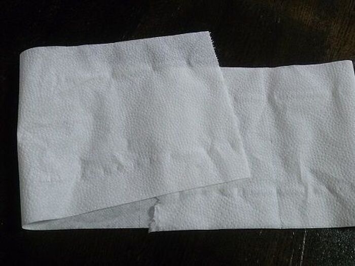 2つ折りもしくは、3つ折りにしたトイレットペーパーで、真ん中をくるんだら、後ろで見えないようんいホッチキスで止めます。