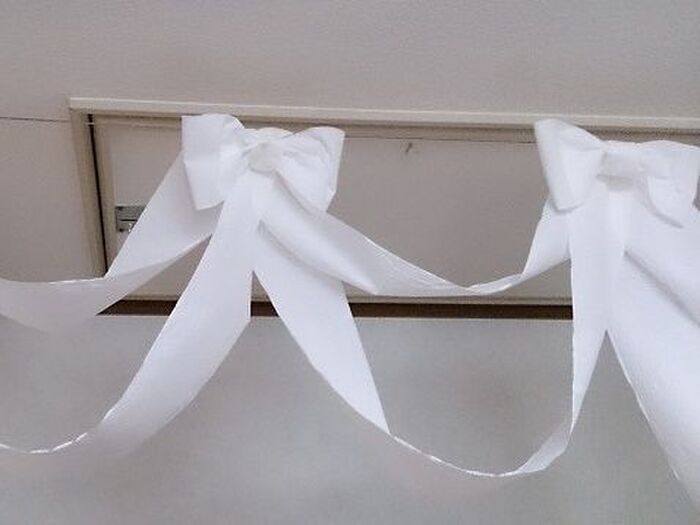 私はカーテンロープにトイレットペーパーを2重にかけ重なるところにリボンを止めたんですが壁に画びょうもしくはテープで貼ってもいいと思います。