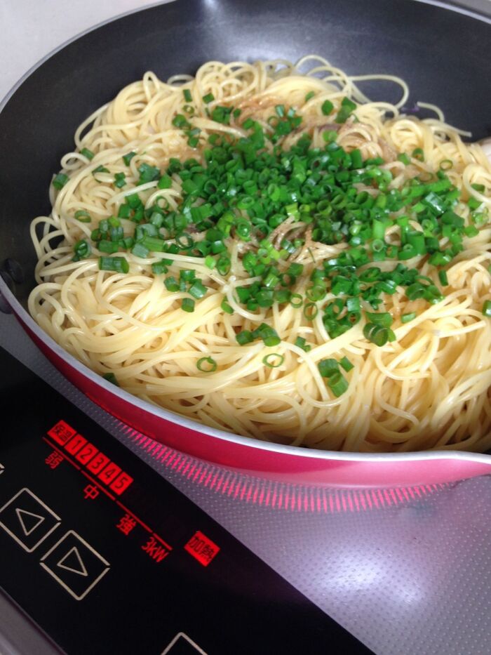 麺を茹で終わったら、さきほどのフライパンに麺を入れます。手早くまぜて、最後に、ネギを加えて、出来上がりです。