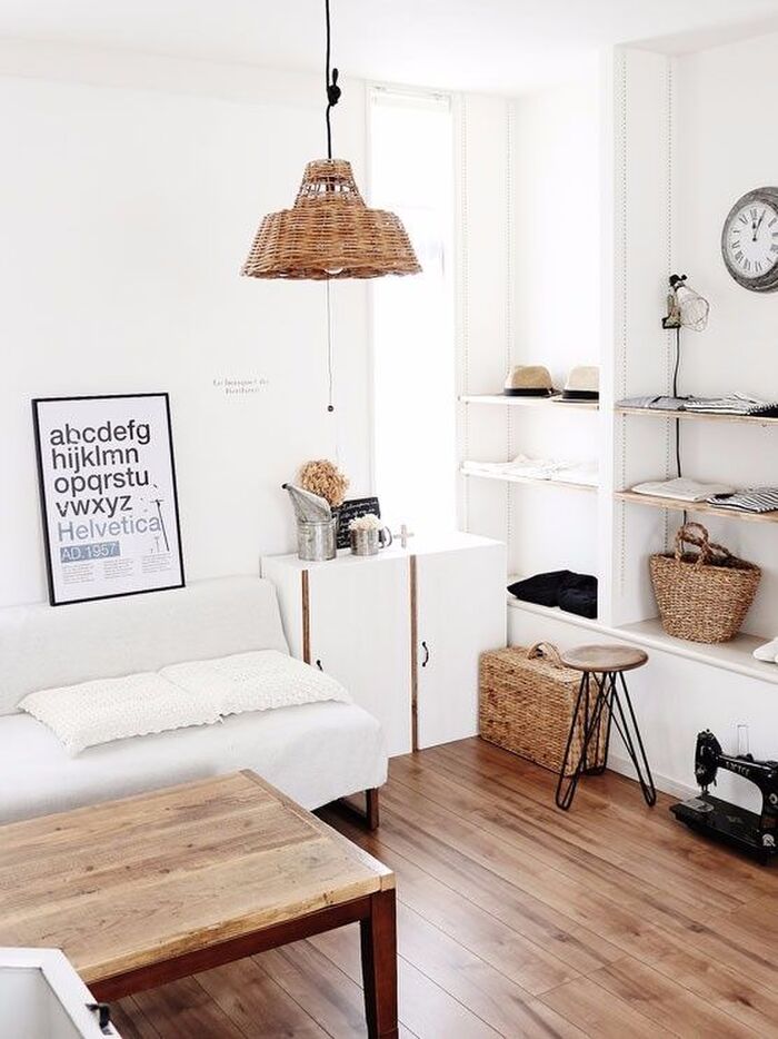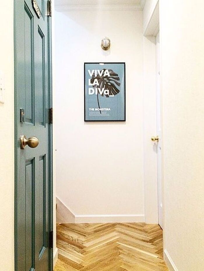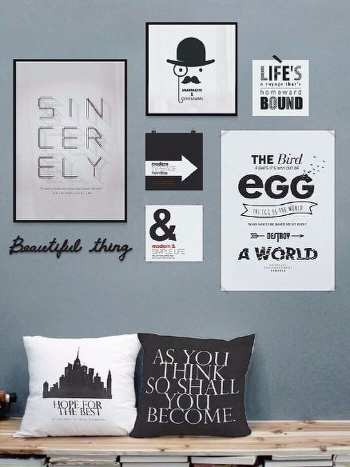 ナチュラルアンティークな雰囲気を、タイポグラフィで引き締めたコーディネート。空間全体のスタイルを壊すことなく、ポスターでポイントを与えています。