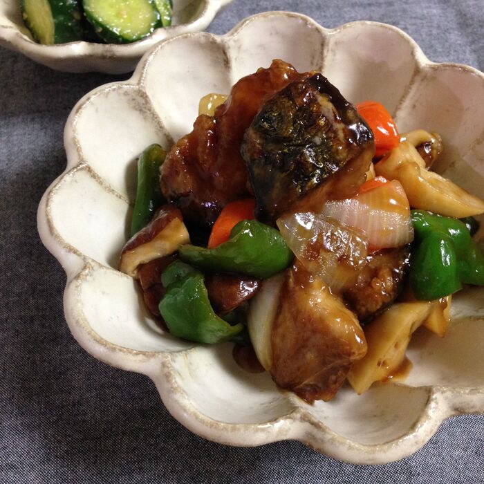 ⑥鯖も加えて炒め合わせ、○調味料を回しかけて混ぜ合わせたら、●水溶き片栗粉も加えとろみを付けて出来上がり。