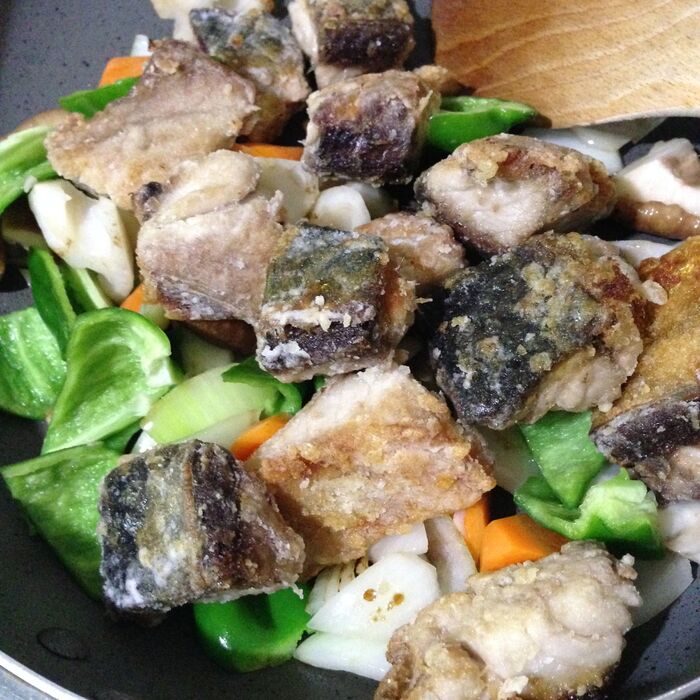 ④鯖に片栗粉をまぶします。フライパンに多めに油を入れ、中火で両面に焦げ目が付くまで焼いたら、一旦取り出しておきます。