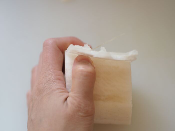 2、1でさした爪楊枝をそのまま下まで引っ張ります。2~3回上から下までなぞります。