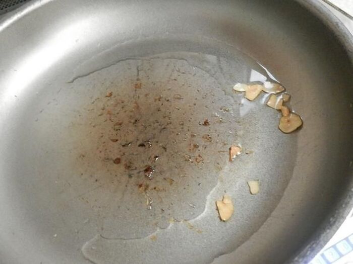 フライパンに油とニンニクチップを入れます。香りがして、ニンニクチップがきつね色になったら取り出します。