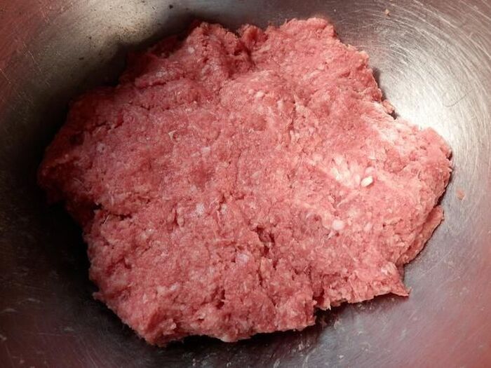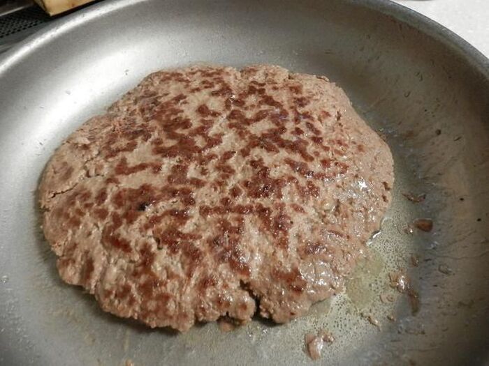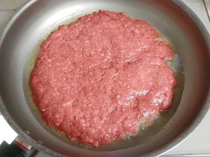 フライパンに肉を入れ、2㎝くらいの厚さになるように広げます。強めの中火で焼き色がつくまで焼きます。