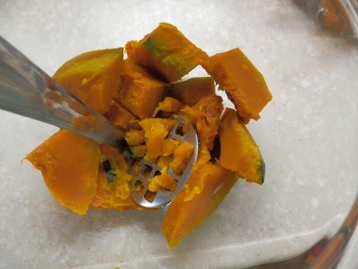 かぼちゃは皮をむき、小さく切って耐熱容器に入れます。電子レンジ600wで2~3分加熱し、熱いうちにつぶします。