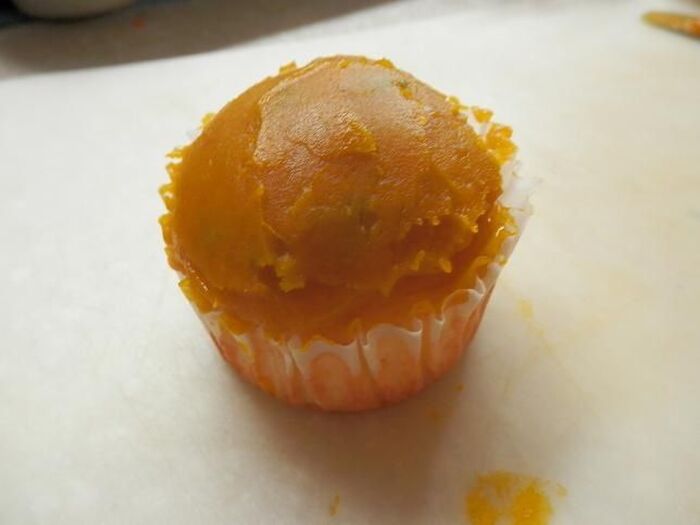 マフィンの上にかぼちゃを乗せて平にし、かぼちゃペーストを絞ってグミをデコしたら完成♪