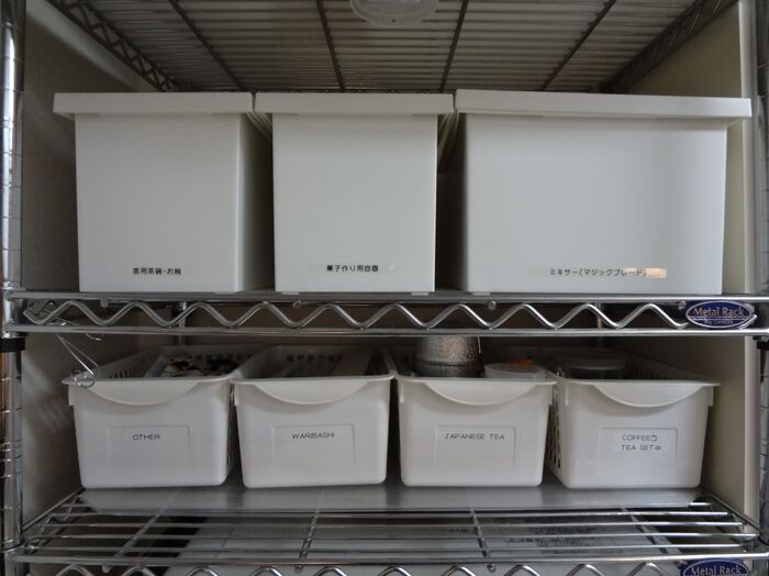 同様に使用頻度の少ないお菓子作りのものやミキサーなどもボックスでおさめています。