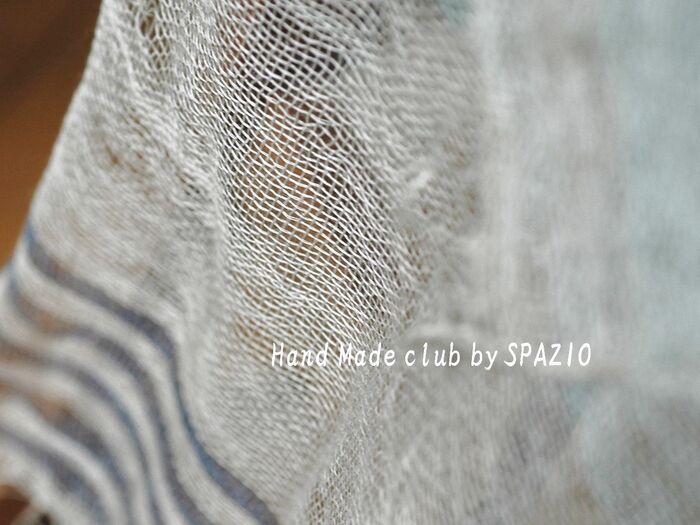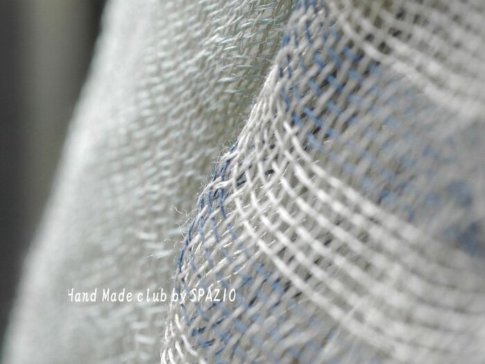 かなり細番手のリネン100%の糸を経糸、緯糸ともに1本どりで織ります。リネンは滑りやすく、織り上がりも糸がよれてしまうなど、少々織りにくいのですが、その風合いがかえって、アンティークな質感を表現してくれました。