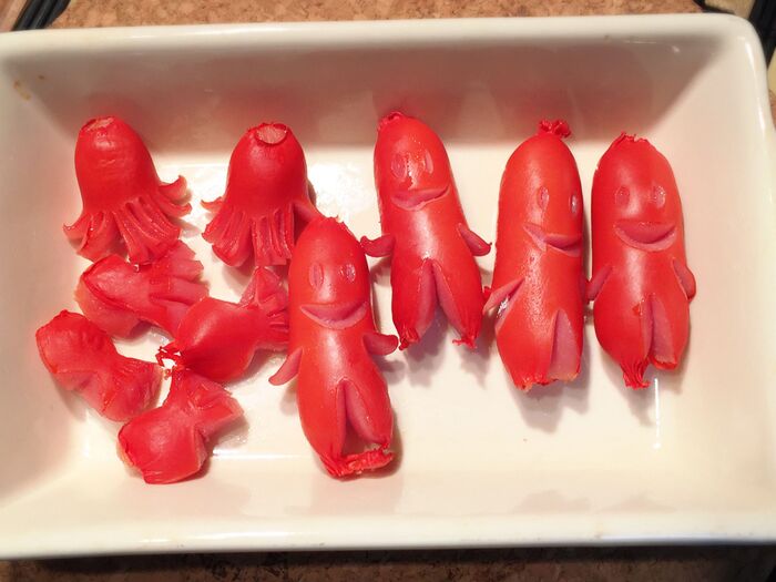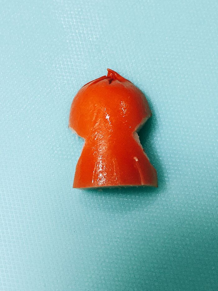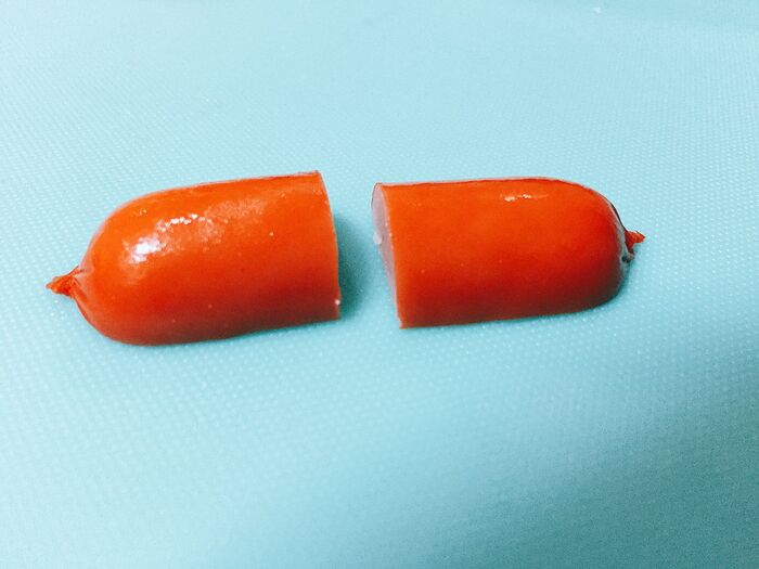 ソーセー人は目、口に切り込みを入れ、手と足部分を切ります。