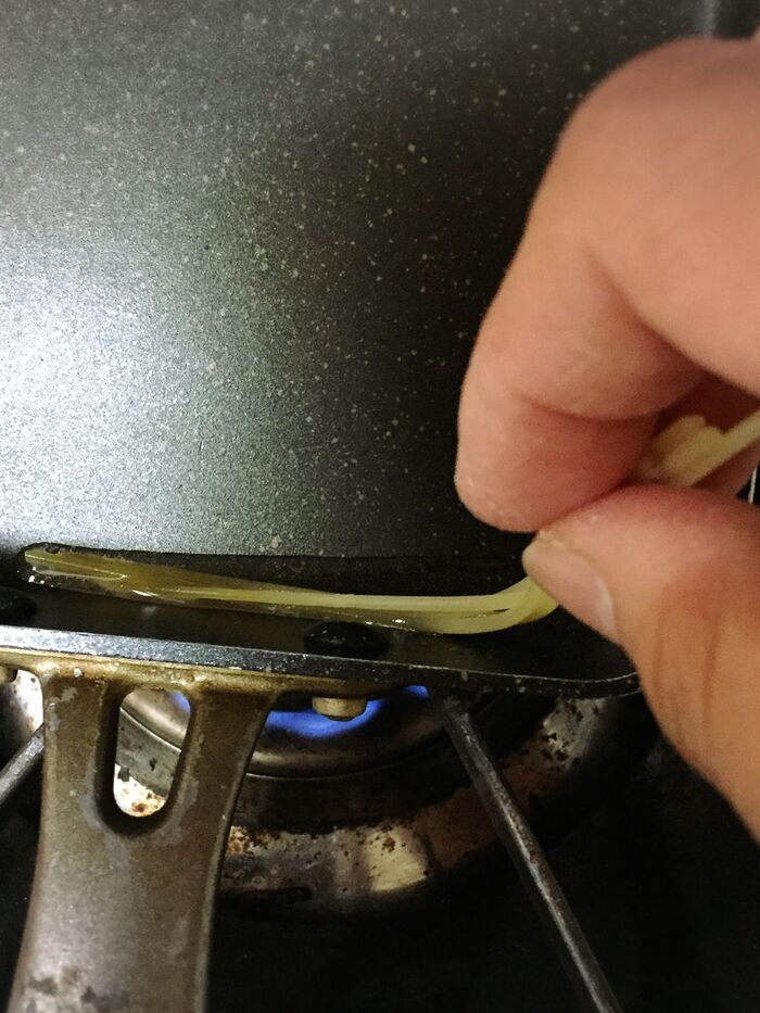 パスタ2本を半分に切り、沸騰したお湯にパスタの茹で時間の間先3〜4cm程残してつけときます。