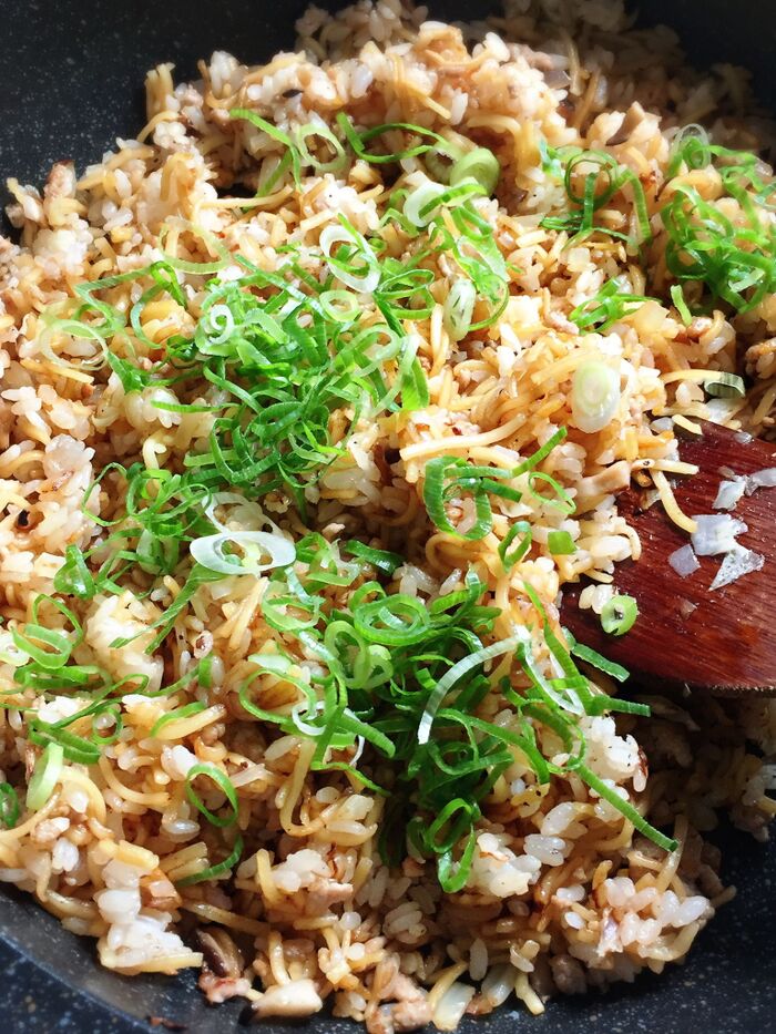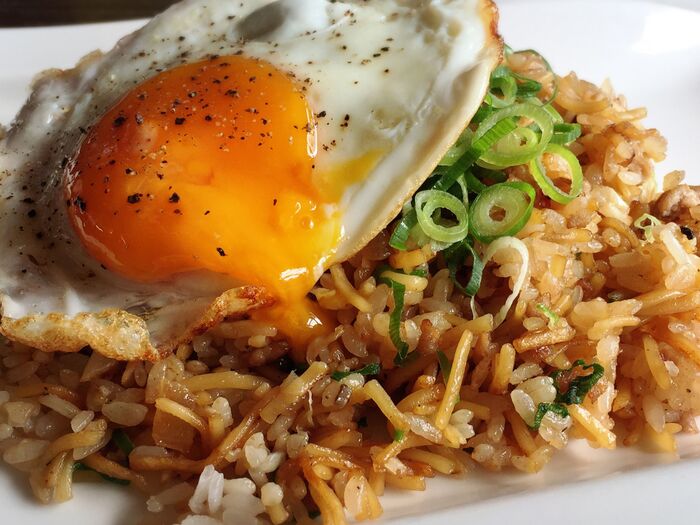 そばめしを入れて目玉焼きをのせ、刻みネギをのせたら出来上がり♪