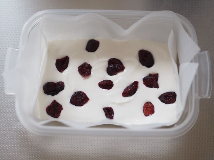 2、1の上にドライクランベリーを散らしながらのせ、あとは冷凍庫に入れて数時間冷やし、完全に凍ったら取り出して適当な大きさに割れば完成です!