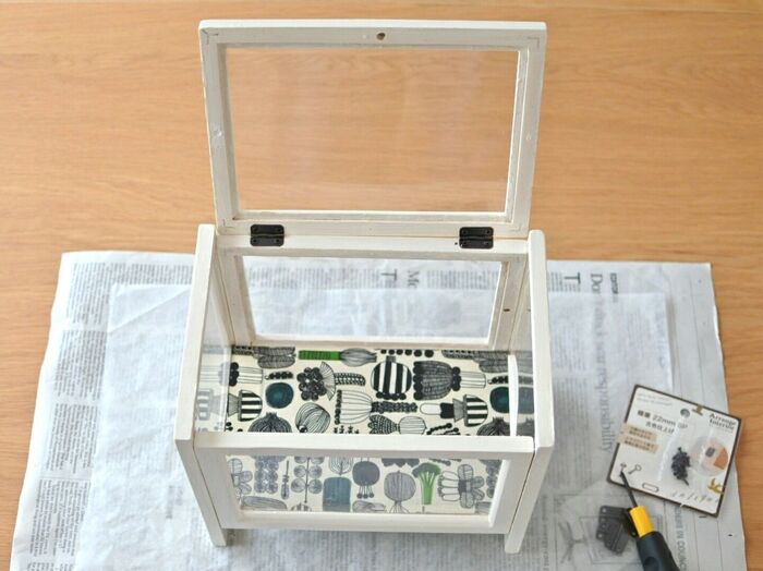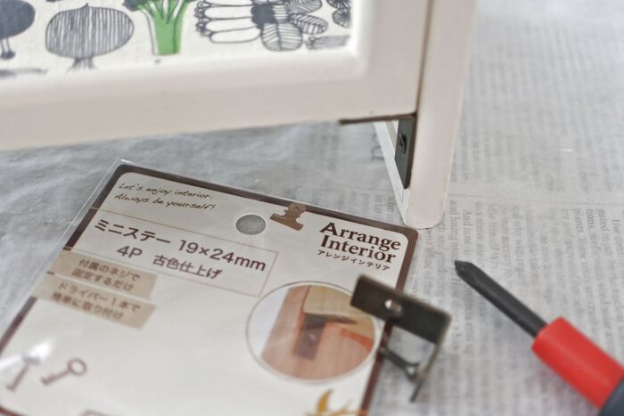 最後に残ったフォトフレーム(前面に透明な板がついたもの)に蝶番を付けます