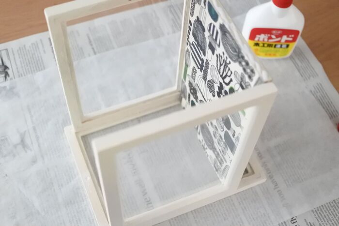枠に接着剤を塗り、フォトフレームについていた透明な板をフォトフレームに貼り付けます